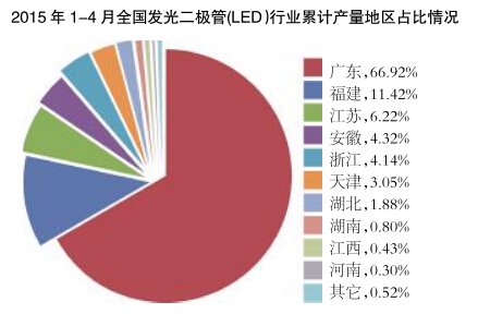 2015年1-4月,全國發(fā)光二極管(LED)行業(yè)完成累計產(chǎn)量1070.69億只,同比增長36.41%,比重主要集中在廣東、福建、江蘇、安徽、浙江等地區(qū)。其中:廣東累計產(chǎn)量716.53億只(占66.92%),同比增長64.76%。