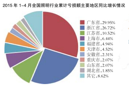 2015年1-4月,全國照明行業(yè)完成累計虧損額9.26億元,同比增長19.14%,比重主要集中在廣東、浙江、江蘇、上海、福建等地區(qū)。其中:廣東省完成累計虧損額2.77億元(占29.95%),同比增長45.72%。