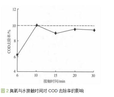 從圖2可以看出,臭氧與污水充分接觸10min后COD去除率約10%,達(dá)到最佳去除效果,故確定臭氧氧化最佳接觸時間為10min。