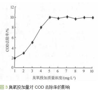 從圖3可以看出,隨著臭氧投加量的增加,COD去除率逐漸上升;當(dāng)臭氧投加質(zhì)量濃度達(dá)到5mg/L時,COD去除率達(dá)到最大(10%左右);隨著臭氧投加量的增加,COD去除率不再有明顯的變化,為了節(jié)約成本,選擇5mg/L為臭氧直接氧化去除COD的最大投加質(zhì)量濃度。