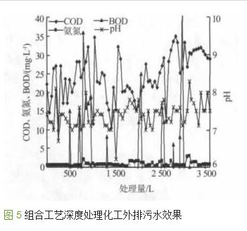 由圖5可以看出,經(jīng)混凝氣浮—臭氧/活性炭處理后,出水COD在9.6~35.0mg/L之間,氨氮在0.3~3.0mg/L之間,BOD在0.1~10.2mg/L之間,pH在6.2~8.3之間,各項(xiàng)指標(biāo)均能穩(wěn)定達(dá)到一級排放標(biāo)準(zhǔn)要求。