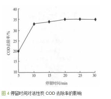 將混凝氣浮處理后的化工外排污水以不同流速流經(jīng)活性炭柱,考察停留時間對活性炭去除COD效果的影響,結(jié)果見圖4。