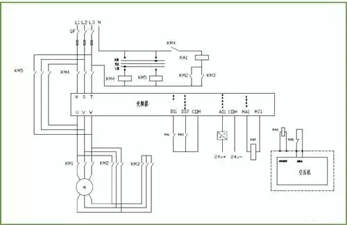 3. 原有系統(tǒng)采用變頻器進(jìn)行調(diào)速后,不能改動空壓機(jī)原來的主回路以及二次回路的控制方式。