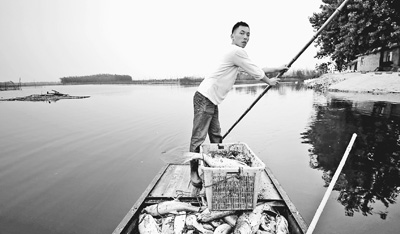 漁民在湖面上打撈漂浮的死魚(yú)。