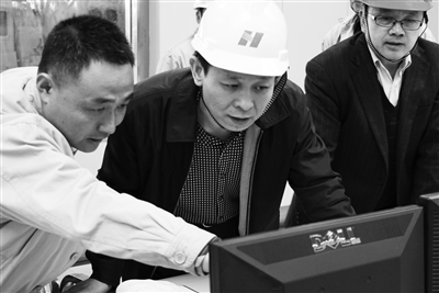圖為萊蕪市環(huán)保局局長(zhǎng)李斌祥(中)現(xiàn)場(chǎng)了解企業(yè)污染物排放控制情況。