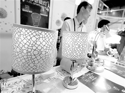 一家照明企業(yè)的工作人員展示內(nèi)置藍(lán)牙芯片、可用手機(jī)調(diào)控的多彩智能燈