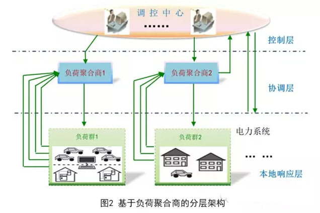 負(fù)荷調(diào)度架構(gòu)包括集中式、分布式和基于負(fù)荷聚合商的分層架構(gòu)。集中式架構(gòu)由電網(wǎng)調(diào)度中心直接給每個(gè)負(fù)荷發(fā)布調(diào)控命令, 這在實(shí)際電網(wǎng)調(diào)度中是不可行的。分布式架構(gòu)具有投資小、通信和控制靈活等優(yōu)點(diǎn), 但完全分散的分布式架構(gòu)面臨過度控制或控制量不足的問題, 難以實(shí)現(xiàn)系統(tǒng)級(jí)控制目標(biāo)?;谪?fù)荷聚合商的分層調(diào)度架構(gòu)同時(shí)具備集中式架構(gòu)的整體協(xié)調(diào)能力和分布式架構(gòu)的分散自治靈活性, 特別適合于居民、商業(yè)等中小負(fù)荷參與調(diào)度運(yùn)行。