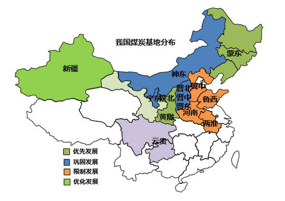 同時(shí),面對(duì)能源賦存條件的限制,“十三五”規(guī)劃的能源生產(chǎn)布局是“五基兩帶”,即東北、山西、鄂爾多斯、西南、新疆5大能源基地,核電及海上2個(gè)能源開(kāi)發(fā)帶。其中,14個(gè)大型煤炭基地的產(chǎn)煤量占全國(guó)煤炭產(chǎn)量的比重在“十三五”期間將達(dá)到95%以上。由于煤炭供給過(guò)剩,因此對(duì)煤炭基地的規(guī)劃將劃分層次,區(qū)別對(duì)待。優(yōu)先開(kāi)發(fā)蒙東、黃隴和陜北基地,鞏固發(fā)展神東、寧東、山西基地,限制發(fā)展東部即冀中、魯西、河南、兩淮基地,優(yōu)化發(fā)展新疆基地。新疆基地將在“十三五”之后發(fā)揮更大作用。