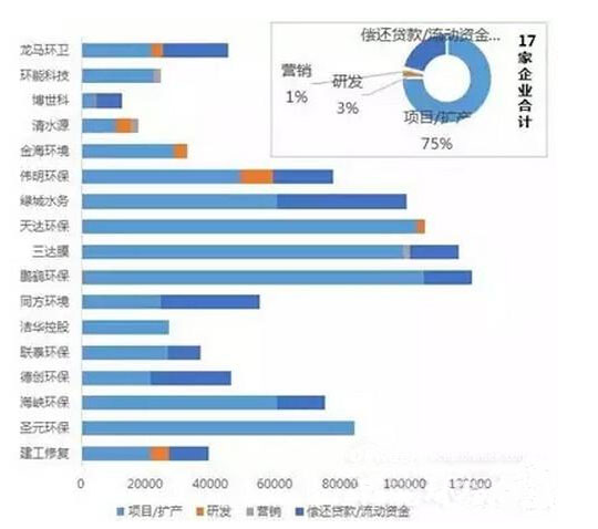 17家企業(yè)總(含擬募資企業(yè))募資額規(guī)模為102億元,平均每家6億元。這102億資金約有3/4用于項目投資、擴(kuò)產(chǎn)上??梢娺@些環(huán)保企業(yè)總體都處在業(yè)務(wù)快速擴(kuò)張期。用于償還貸款和補(bǔ)充流動資金、研發(fā)、營銷的部分分別占21%、3%和1%。