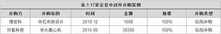 整體來看,這些成長中的環(huán)保企業(yè)還未具有大規(guī)模對外并購快速擴(kuò)大業(yè)務(wù)規(guī)模的能力,17家企業(yè)發(fā)生過的對外并購案例(非關(guān)聯(lián)交易)數(shù)量較少。如表-1所示,有兩家企業(yè)在過去發(fā)生過此類并購交易。有趣的是,這兩個交易都屬于以能力獲得,補(bǔ)全業(yè)務(wù)鏈為目的的縱向并購。博世科收購華億市政設(shè)計為加強(qiáng)設(shè)計能力,環(huán)能科技是華大離心機(jī)則為獲得污泥處理能力。