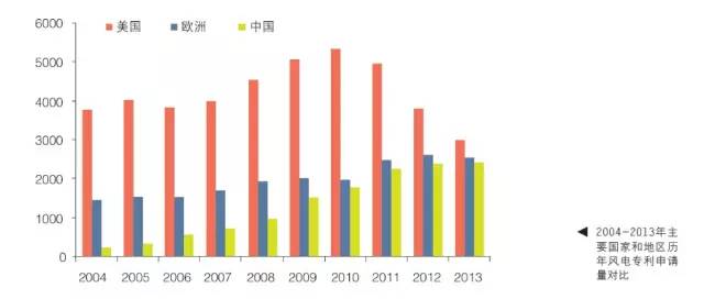 2004-2013年主要國家和地區(qū)歷年風(fēng)電專利申請量對比
