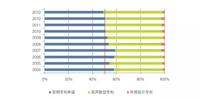 而從企業(yè)所申請的專利類型來看,我國風(fēng)電專利類型分為發(fā)明專利、實用新型專利、外觀設(shè)計專利。發(fā)明專利的保護期為20 年,實用新型的保護期為10 年。相比而言,發(fā)明專利對創(chuàng)造性的要求更高,因而保護期限更長,也更有價值。然而,雖然我國企業(yè)申請的風(fēng)電專利主要集中在發(fā)明專利和實用新型專利上,并且發(fā)明專利與實用新型專利的申請量在2004 年至2013 年都呈現(xiàn)持續(xù)攀升的態(tài)勢,但從這兩項專利類型占比的變化來看,2004 年至2010 年發(fā)明專利申請量占比超過50% ,近兩年卻不足50% ,而實用新型專利卻顯示增長態(tài)勢。更高的實用新型專利占比,意味著更低的價值產(chǎn)出,這當(dāng)然不是我們希望看到的局面。