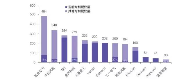 此外,在發(fā)明授權(quán)量占總授權(quán)量的比例上,我國企業(yè)的數(shù)據(jù)也相當(dāng)?shù)停瑑H僅不足20% 。一些國外企業(yè), ,如GE 、Vestas 、Siemens 、Enercon 、Gamesa 、REpower 等,發(fā)明授權(quán)量占比卻達到90% ,甚至是100% 。