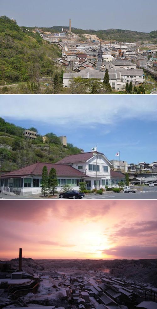 圖2:細倉金屬礦業(yè)的總部和細倉礦山。據(jù)稱鼎盛時期有3000名工人。礦山內(nèi)的全貌(上),從正門可以看到事務所(左下),雪景和日出(右下)(攝影:細倉金屬礦業(yè))