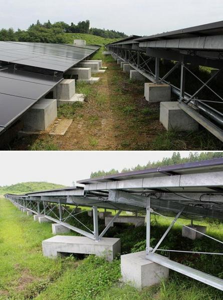 而在排水溝上方要設置太陽能電池板之處,則使用了形似橋墩與橋板一體化的橋梁形狀混凝土基礎跨過排水溝,在上面安裝了架臺。
