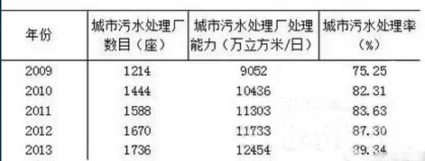 2013年末,全國城市共有污水處理廠1736座,比上年增加66座,污水廠日處理能力12454萬立方米,比上年增長6.1%,排水管道長度46.5萬公里,比上年增長5.9%。城市年污水處理總量381.9億立方米,城市污水處理率89.34%,比上年增加2.04個百分點,其中污水處理廠集中處理率84.53%,比上年增加2.04個百分點。