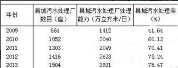 2013年末,全國縣城共有污水處理廠1504座,比上年增加88座,污水廠日處理能力2691萬立方米,比上年增長2.6%,排水管道長度14.9萬公里,比上年增長8.8%??h城全年污水處理總量69.1億立方米,污水處理率78.47%,比上年增加3.23個百分點,其中污水處理廠集中處理率76.25%,比上年增加3.34個百分點。