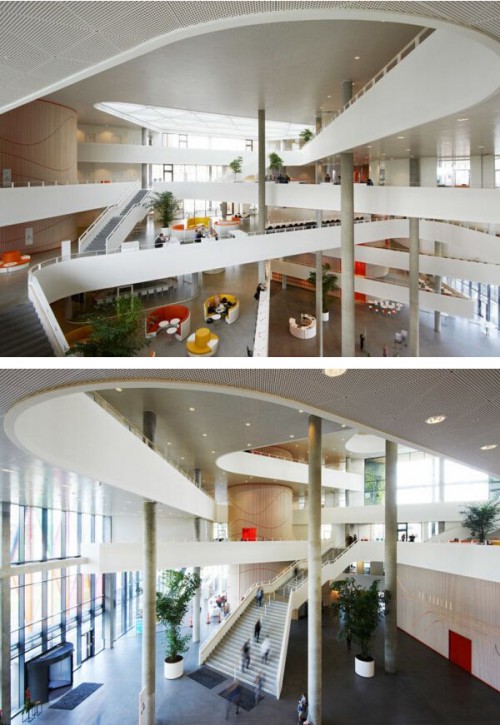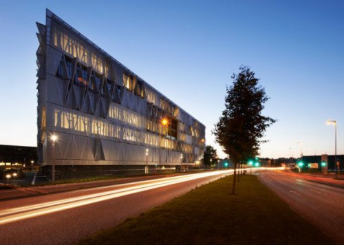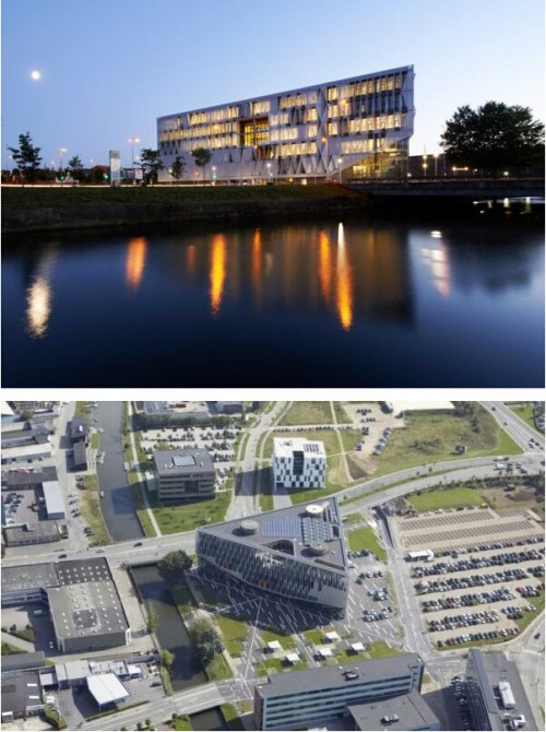 Henning Larsen 建筑公司為南丹麥大學(xué)(科靈校區(qū))建了一座三角立方體的大樓,在科靈河畔。其中花了很多節(jié)約能源和被動(dòng)式設(shè)計(jì)的心思,希望借此設(shè)立一個(gè)綠色設(shè)計(jì)的新標(biāo)桿。建筑外立面覆蓋著 1600 塊三角形的“鱗片”,有內(nèi)部錯(cuò)位的樓梯與中庭的視覺(jué)效果。