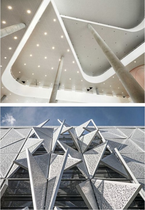 三角結(jié)構(gòu)的穩(wěn)定性帶給這棟建筑靈感,而表面的三角“鱗片”實(shí)際上是帶孔的金屬遮陽(yáng)板,根據(jù)傳感器監(jiān)測(cè)到的熱度和亮度,來(lái)調(diào)整每塊金屬板開(kāi)合的角度,不同的組合帶來(lái)多變且有趣的視覺(jué)體驗(yàn),同時(shí)確保室內(nèi)最舒適的環(huán)境。