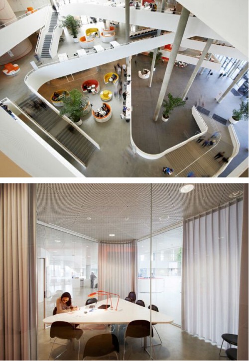 大樓內(nèi)部許多教室和會(huì)議區(qū)都安裝玻璃墻,以增加通透性,同時(shí)簾子可以在需要隱私性時(shí)靈活使用。一些非正式會(huì)議在開(kāi)放的長(zhǎng)椅和桌子處進(jìn)行,而安靜的區(qū)域位于建筑外圍一圈。公司還特別定制了一些三角桌和半圓的環(huán)形沙發(fā)在辦公區(qū)。