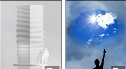 荷蘭設計師計劃建造能夠吞噬霧霾的“空氣凈化塔”,左圖是空氣凈化塔模擬圖,右圖是沒有霧霾浮塵顆粒的天空,同時,空氣凈化塔凈化每1000立方米大氣將收集的空氣浮塵微粒制作成一個“霧霾立方體”寶石戒指。