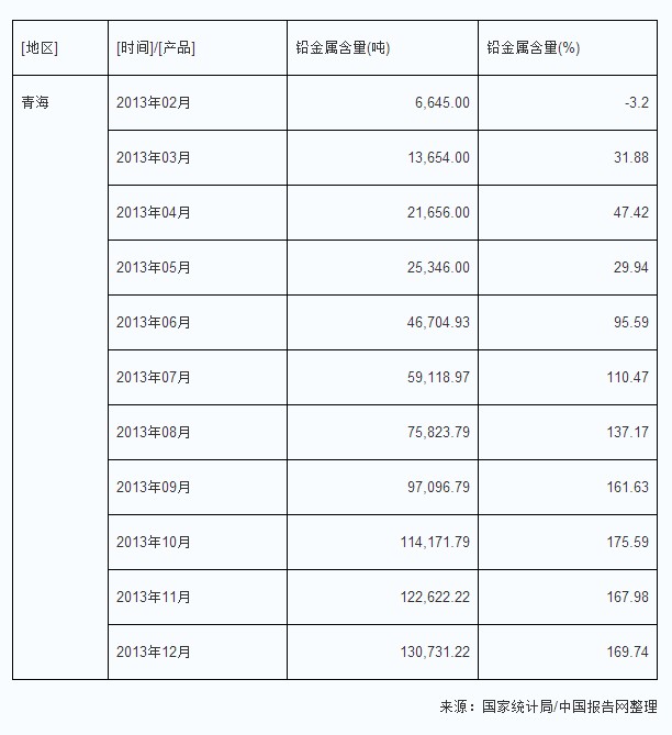 2013年青海地區(qū)鉛金屬生產(chǎn)量及增速情況