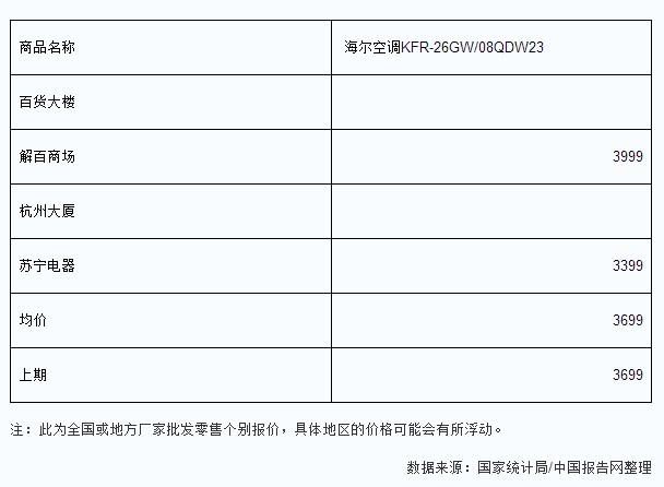 2014年3月杭州市主要家電商場海爾空調(diào)KFR-26GW/08QDW23零售價(jià)格統(tǒng)計(jì)表