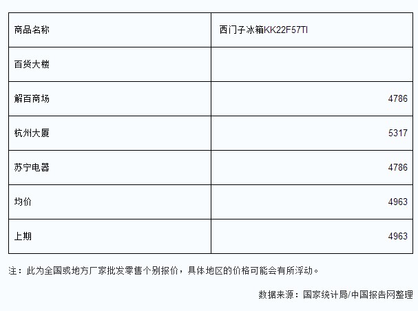 2014年3月杭州市主要家電商場(chǎng)西門(mén)子冰箱KK22F57TI零售價(jià)格統(tǒng)計(jì)表