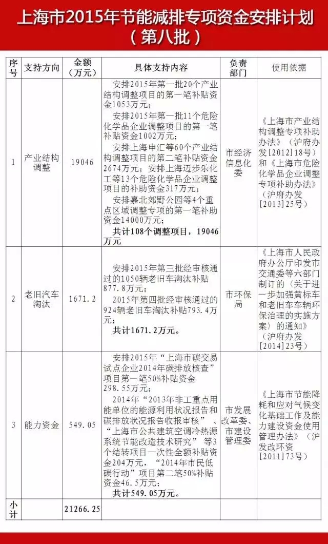 1、根據(jù)《上海市產(chǎn)業(yè)結(jié)構(gòu)調(diào)整專項補助辦法》(滬府辦發(fā)[2012]18號)和《上海市危險化學(xué)品企業(yè)調(diào)整專項補助辦法》(滬府辦發(fā)[2013]25號)規(guī)定,安排2015年第一批20個產(chǎn)業(yè)結(jié)構(gòu)調(diào)整項目的第一筆補貼資金1053萬元;安排2015年第一批11個危險化學(xué)品企業(yè)調(diào)整項目的第一筆補貼資金1002萬元;安排上海申匯等60個產(chǎn)業(yè)結(jié)構(gòu)調(diào)整項目的第二筆補貼資金2674萬元;安排上海邁步樂化工等13個危險化學(xué)品企業(yè)調(diào)整項目的補助資金317萬元;安排嘉北郊野公園等4個重點區(qū)域調(diào)整專項的第一筆補助資金14000萬元;共計108個調(diào)整項目,19046萬元。