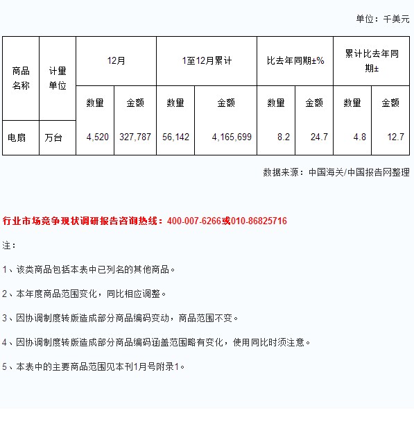 2013年1-12月中國電扇出口量及增速統(tǒng)計