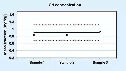 圖4.檢測到的鎘濃度(直線:標(biāo)準(zhǔn)值;點化線:DINEN14902標(biāo)準(zhǔn)規(guī)定的上下限。)