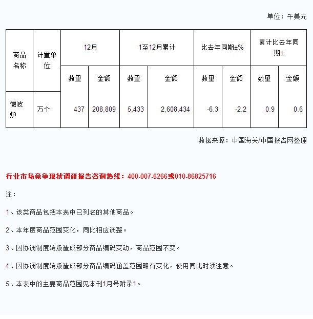2013年1-12月中國(guó)微波爐出口量及增速統(tǒng)計(jì)