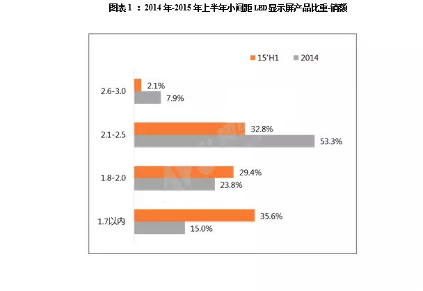 小間距LED產(chǎn)品自2013年以來,P2.0、P1.8、P1.5、P1.4、P1.2層出不窮,從銷售比重來看,P2.5以下產(chǎn)品銷量已經(jīng)開始有下降趨勢,銷額比重來看,2015年上半年P(guān)2.5以下、P2.0和P1.6產(chǎn)品幾乎是三分天下的局面,與2014年產(chǎn)品格局發(fā)生非常大的變化。