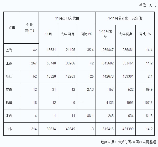 2013年11月中國華東地區(qū)專用設(shè)備制造業(yè)出口交貨值統(tǒng)計