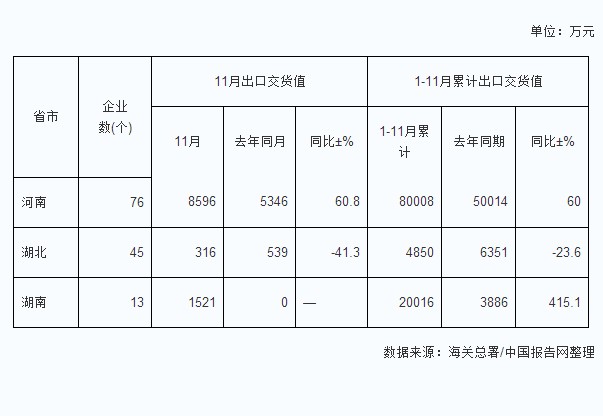 2013年11月中國(guó)華中地區(qū)專用設(shè)備制造業(yè)出口交貨值統(tǒng)計(jì)