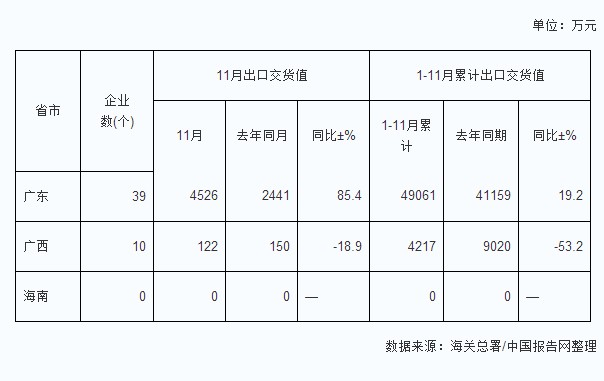 2013年11月中國華南地區(qū)專用設(shè)備制造業(yè)出口交貨值統(tǒng)計
