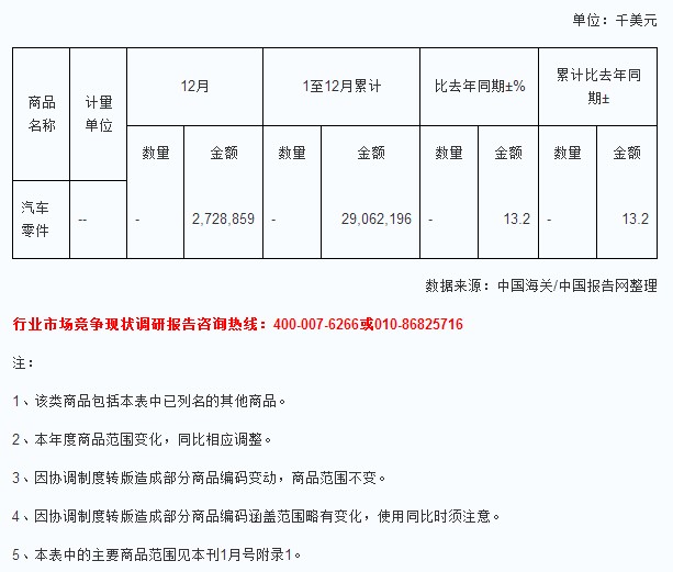 2013年1-12月中國汽車零件出口量及增速統(tǒng)計