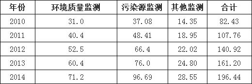 2010-2014年中國環(huán)境監(jiān)測細(xì)分市場規(guī)模(單位:億元)