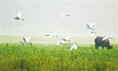 近年來(lái),我國(guó)生態(tài)保護(hù)工作持續(xù)加強(qiáng),生態(tài)功能保護(hù)成效顯著。圖為全國(guó)生態(tài)縣——四川省蒲江縣成佳鎮(zhèn)濕地鷺飛草長(zhǎng)的田園景象。