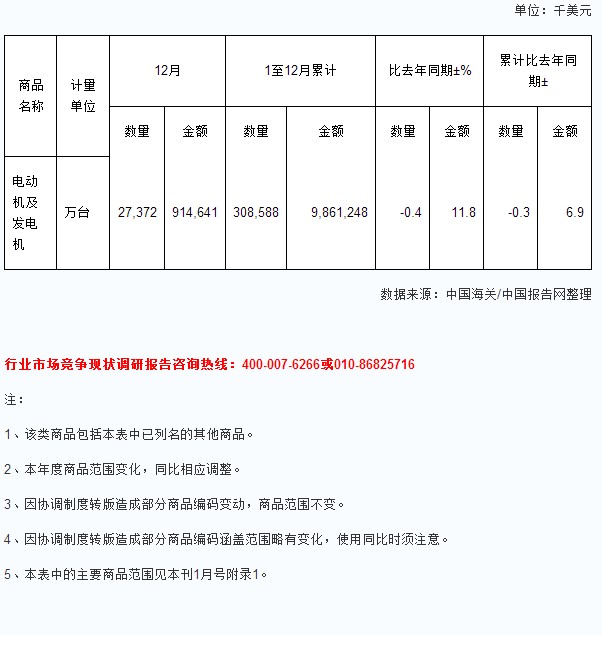 2013年1-12月中國電動(dòng)機(jī)及發(fā)電機(jī)出口量及增速統(tǒng)計(jì)