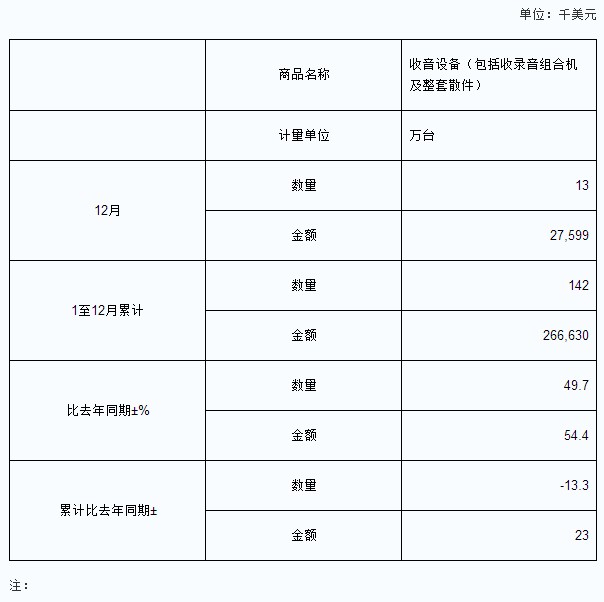 2013年1-12月中國(guó)進(jìn)口收音設(shè)備(包括收錄音組合機(jī)及整套散件)商品數(shù)量及增速同比