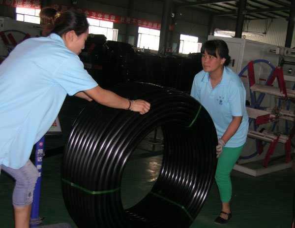 8月2日,工人將剛生產出來的噴灌管線封裝打捆。