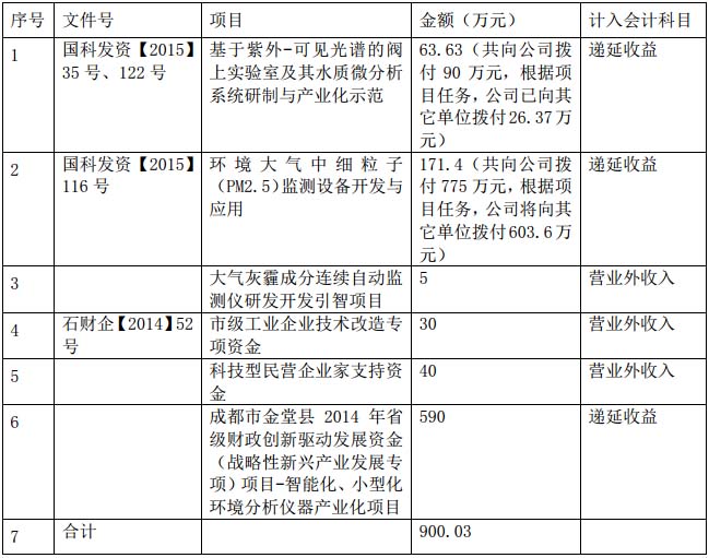 根據(jù)相關(guān)文件及政策,河北先河環(huán)??萍脊煞萦邢薰?以下簡稱“公司”)截止到公告披露日收到政府補助資金為900.03萬元,根據(jù)會計準則相關(guān)規(guī)定,進行賬務(wù)處理,具體明細如下: