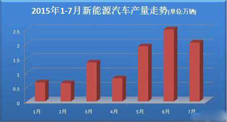 通過1-7月的新能源汽車產(chǎn)量數(shù)據(jù)圖我們可明顯看出,7月份新能源汽車產(chǎn)量略有回落,環(huán)比下降18.4%,同比增長2.5倍。雖然銷量數(shù)據(jù)還未公布,但根據(jù)上半年的銷量數(shù)據(jù)來看,7月的銷量數(shù)據(jù)有可能在6月的2.1萬輛左右徘徊。而今年1-7月,我國新能源汽車累計生產(chǎn)已達9.89萬輛,同比增長3倍。