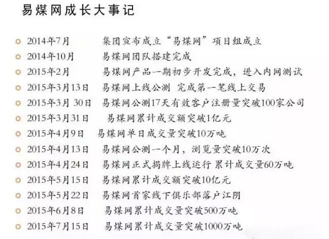 上線3個月來、易煤網(wǎng)累計成交量已經(jīng)突破1500萬噸,預(yù)計到年底達到3000萬噸。同時,他還認為、基于行業(yè)對互聯(lián)網(wǎng)認識的提高和自身服務(wù)能力的提高,5年內(nèi)易煤網(wǎng)年交易量將達到兩三億噸。