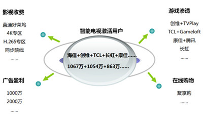 其二,智能電視內(nèi)容與服務(wù)的價(jià)值初現(xiàn)?,F(xiàn)階段,彩電企業(yè)在智能電視內(nèi)容和服務(wù)上的資源整合已初具規(guī)模,涉及視頻、游戲、購(gòu)物、資訊等多個(gè)方面,而在此基礎(chǔ)上的智能電視大屏價(jià)值已初露端倪。