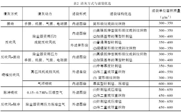上述不同清灰方式的除塵器應(yīng)選用不同織造和規(guī)格的濾袋品種,優(yōu)選順序見表2。