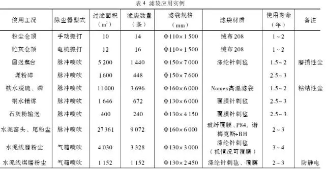 表4是五種濾袋的工程應(yīng)用實(shí)例,從表4可一看出一般濾袋使用壽命均在2年以上,只有過濾焦粉的MP922和高溫濾袋使用壽命較短,這是由于粉塵和氣體性質(zhì)造成的。圓形濾筒除塵濾袋使用壽命都很長,是因?yàn)闉V袋質(zhì)地好。