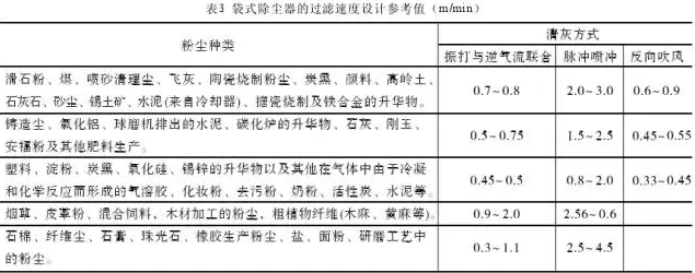 在實(shí)際應(yīng)用過程中,過濾速度是由濾料種類、粉塵粒徑的大小、物理化學(xué)性質(zhì)和其清灰方式等確定的。過濾速度大,會使濾料兩側(cè)的壓差增大,把已附在濾料上的細(xì)小粉塵擠壓過去,使過濾效率降低達(dá)不到規(guī)定的排放值或磨損濾料的單根纖維,尤其使玻纖濾料加速損壞。過濾速度小,則會增大除塵器的體積,從而增加投資。表3列出了袋式除塵器的過濾速度設(shè)計(jì)參考值。