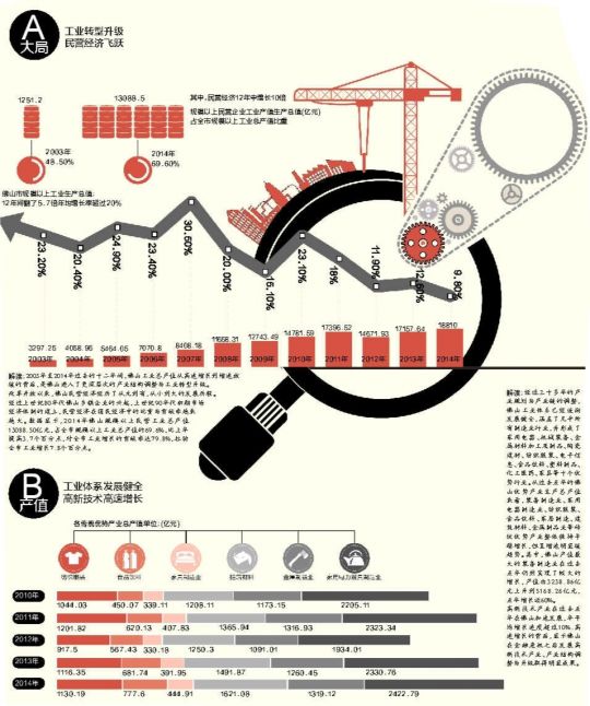 解讀:2003年至2014年過去的十二年間,佛山工業(yè)總產(chǎn)值從高速增長(zhǎng)到增速放緩的背后,是佛山進(jìn)入了更深層次的產(chǎn)業(yè)結(jié)構(gòu)調(diào)整與工業(yè)轉(zhuǎn)型升級(jí)。